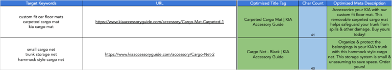 I was part of a small SEO team responsible for restructuring the Kia Parts website and optimizing for SEO. We landed on a comprehensive strategy consisting of URL restructuring, redirecting old URLs, implementing open graph and schema markup, performing product keyword research, and developing an automated solution to mass-upload meta descriptions with an FTP protocol.